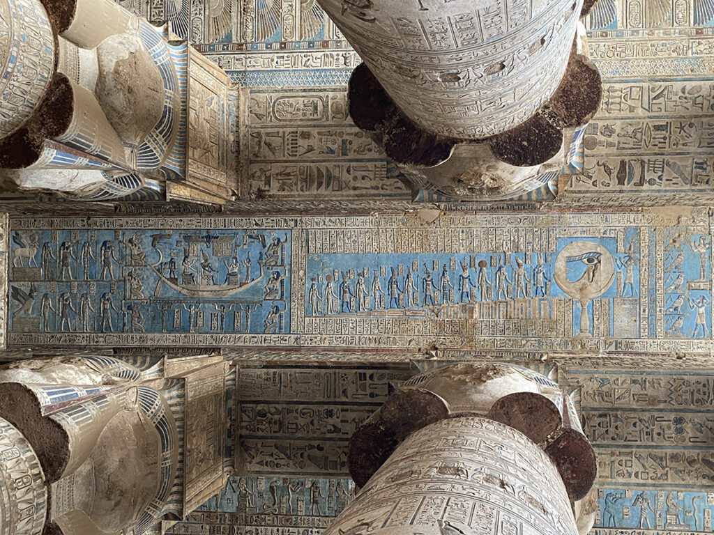さて、列柱室に入ってもハトホルの顔は…全部削られていますが、それより何よりすごいのが天井のレリーフです!!