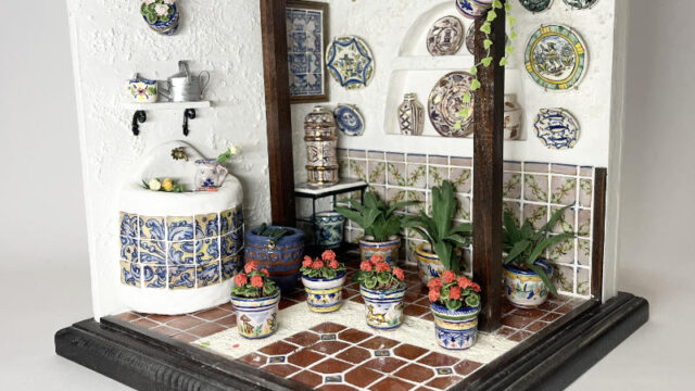2005年の教室展覧会に出したドールハウスを修繕しました。ケースに入れているためホコリは無いですが、経年劣化しています。外してありますが、20cm角の立方体ケースを被せてありました。葉っぱがもげていたり、地面の砂地が汚れていたり。なぜか壁の...