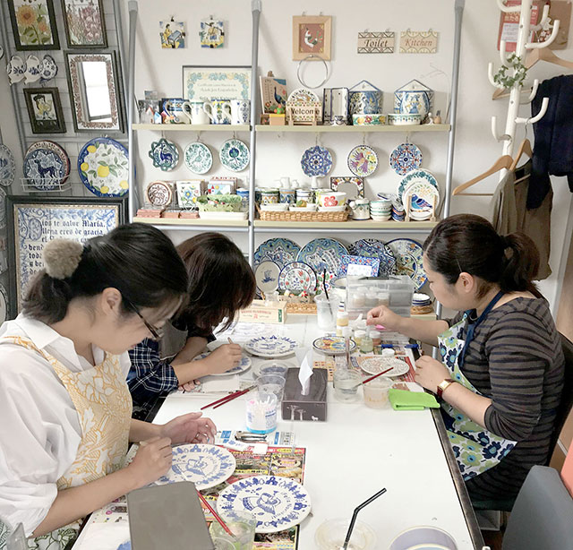 絵付け教室では、ご自身の興味や関心、ペースに合わせて絵付けを楽しめるように、トライアルコースをはじめ、不定期ですが特別講習(夏、冬の予定)の開催、短期コース、通年コースなどを設けております。スペインのおおらかで明るいデザインや絵付けの楽しさは、日常の中でリフレッシュタイムになること間違いなし!ぜひトライしにいらして下さいね。