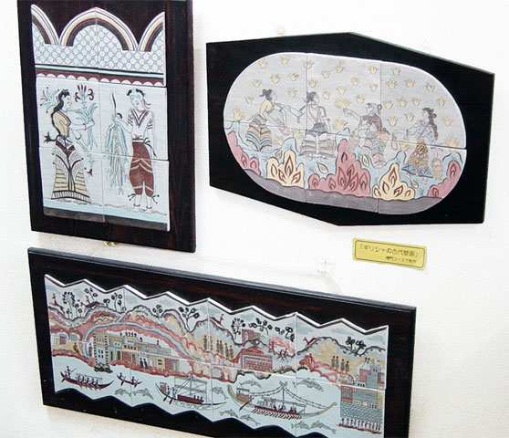 古代ギリシャの壁画や陶器に描かれている「黒絵」をタイルや皿に応用します。